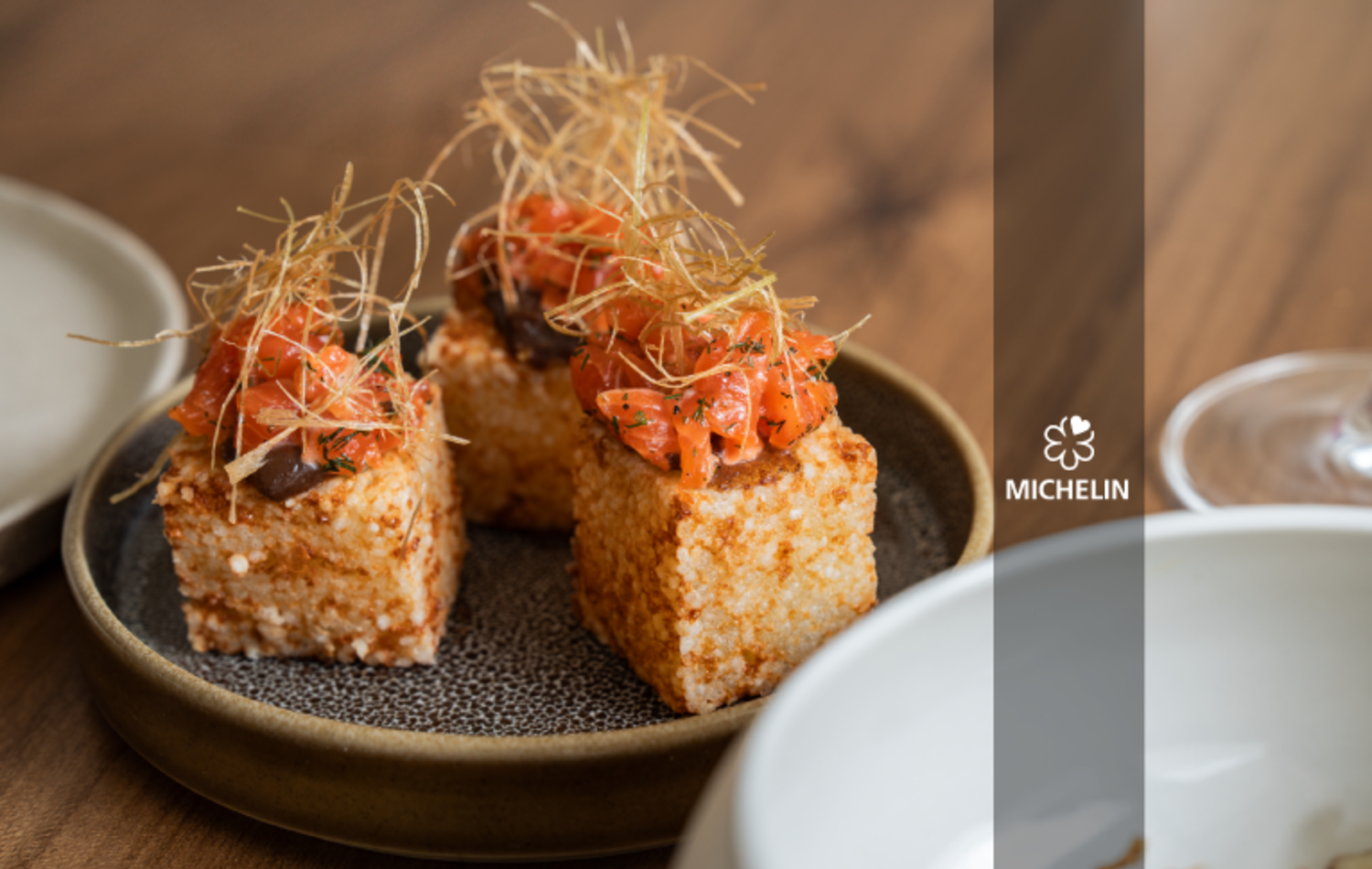 • Dados de tapioca y provolone, tartar de trucha, sweet chilli