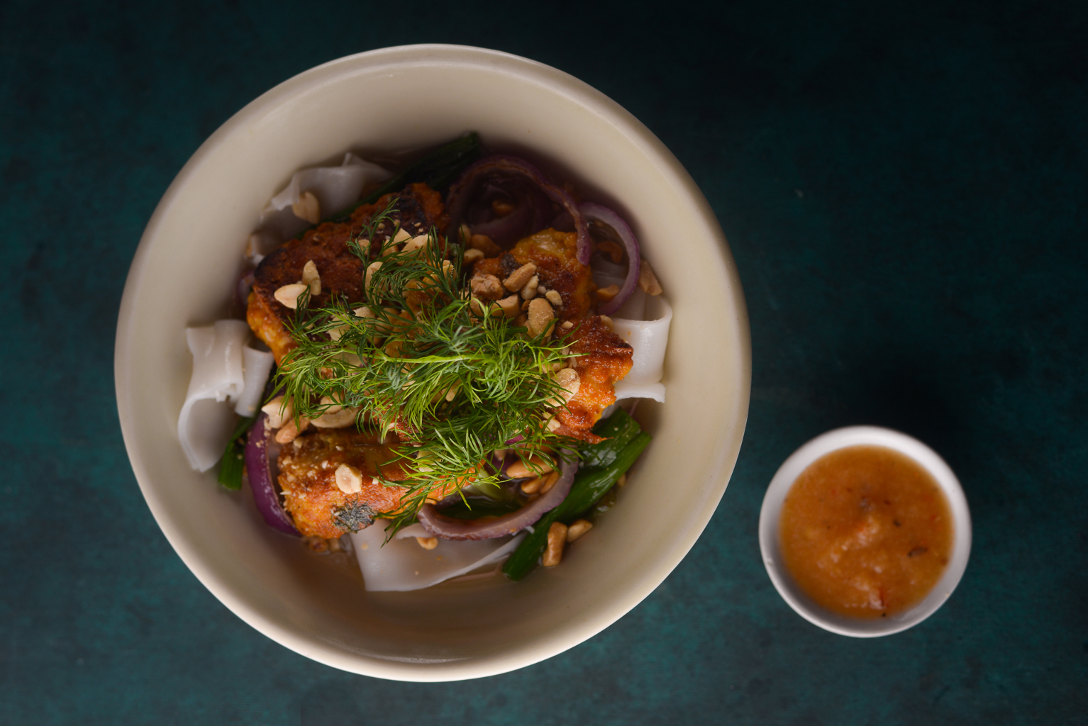• Cha ca - Salteado de pescado marinado en cúrcuma y eneldo. Fideos de arroz. Pickles. Hierbas. Salsa nouc cham tibia