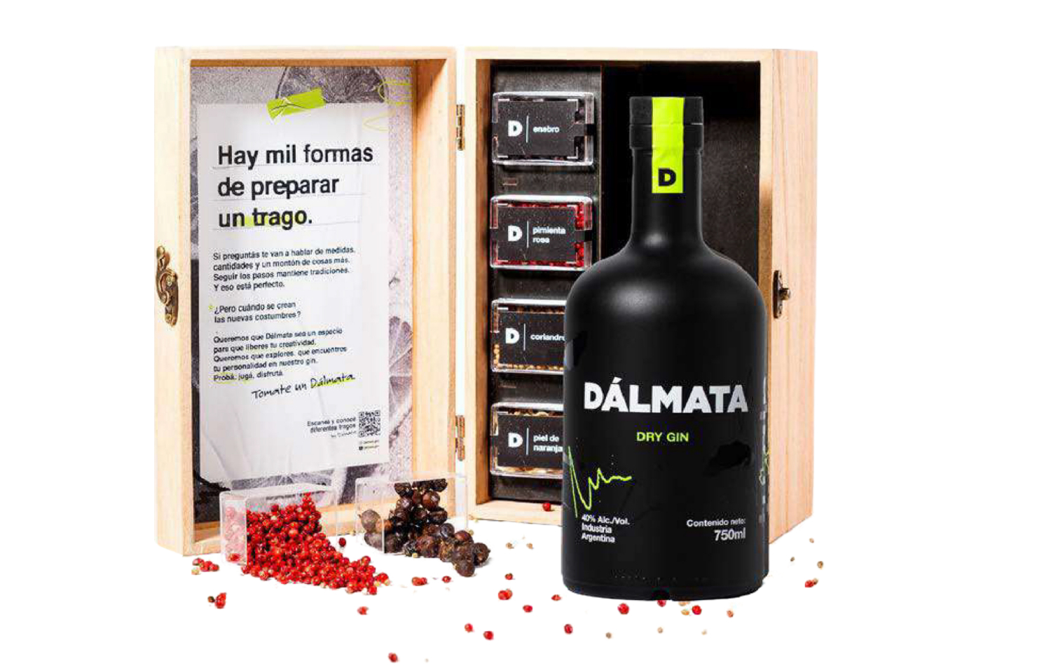 Este kit es ideal para quienes buscan descubrir y disfrutar de nuevos sabores y aromas en cada trago. Incluye una botella de Gin Dálmata Clásico 750 ml y cuatro botánicos naturales (enebro, pimienta rosa, coriandro y piel de naranja) que realzan cada nota del gin. Además, incluye una carta interna con QR interactivo, donde vas a encontrar recetas de tragos únicos y combinaciones para explorar. Perfecta para dar un toque especial a tus cócteles y disfrutar de un momento lleno de sabor.